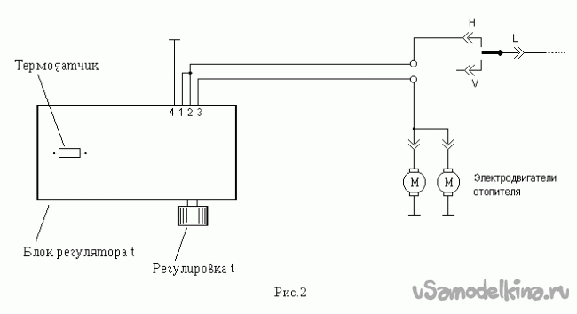 Сигнал разбаланса с диагонали моста поступает на вход компаратора DA1. C выхода компаратора сигнал поступает на транзисторный ключ Т1, нагрузкой которого служит реле K1. Порог переключения задается резистором R6. При низкой температуре (ниже порога, установленного резистором R6) транзистор открыт, контакты реле К1.1 замкнуты, электродвигатели отопителя включены и подают теплый воздух в кабину. При повышении температуры в кабине сопротивление термодатчика R2 уменьшается, компаратор закрывает транзистор, реле обесточивается и выключает питание электродвигателей отопителя. Для более четкой работы термостабилизатора предусмотрен "гистерезис" компаратора, обеспечиваемый цепью R7, R3. Напряжение питания измерительного моста и компаратора стабилизировано параметрическим стабилизатором R10,VD1. Размеры печатной платы изготовленного образца – 66*57мм, толщина – 1,5 мм. В регуляторе применены постоянные резисторы МЛТ-0,25, переменный - СПЗ-4М; конденсаторы С1 – КМ4, С2 – танталовый , СЗ - К73-17. Диоды VD2, VD3 – КД243Г. Терморезистор - KМТ-1, реле - РЭС-6, паспорт РФО.452.103. Один из вариантов схемы подключения регулятора к электрооборудованию грузовика КАМАЗ показан на рис.2. Устройство включается в разрыв провода, идущего с пульта управления на электродвигатели отопителя.