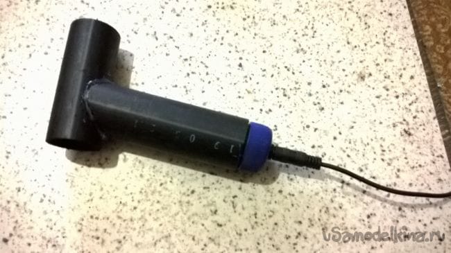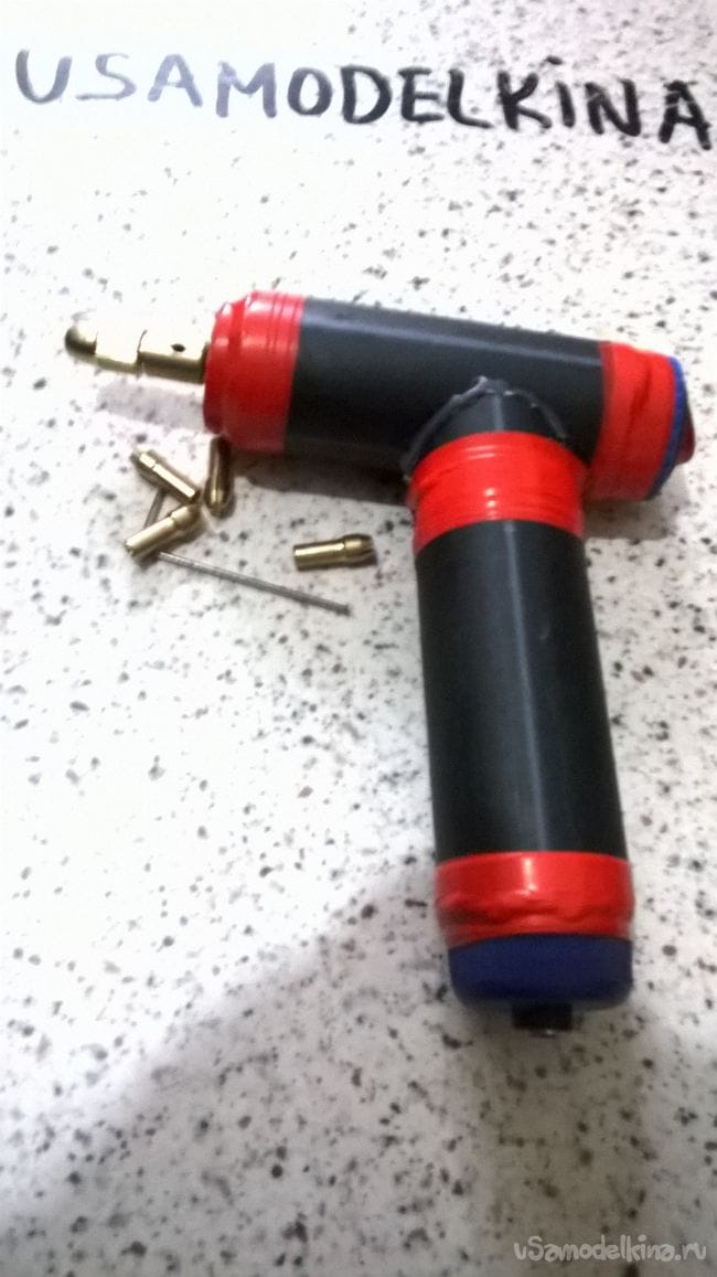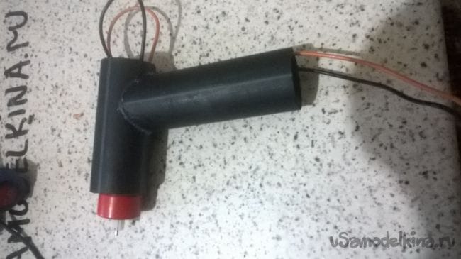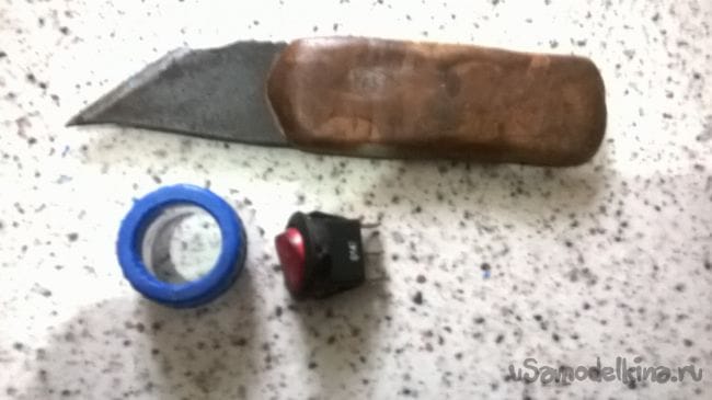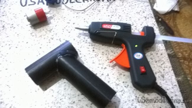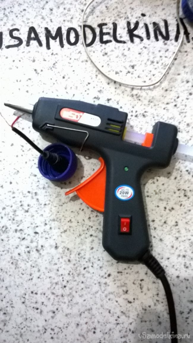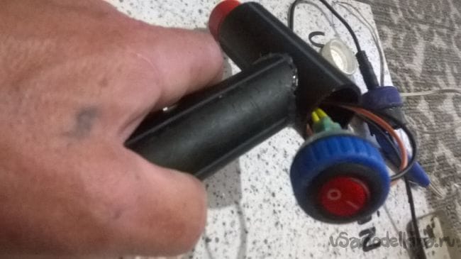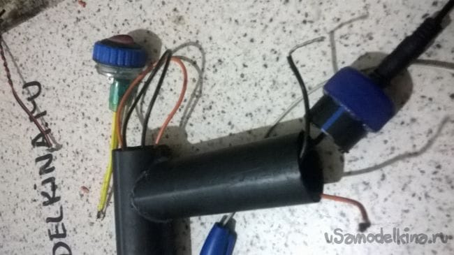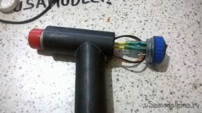 Затем приклеиваем ручку к корпусу.Незабываем проделать отверстие внутри склейки,для проводов.