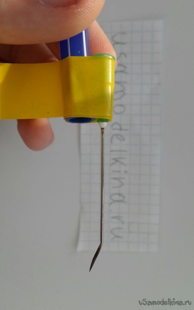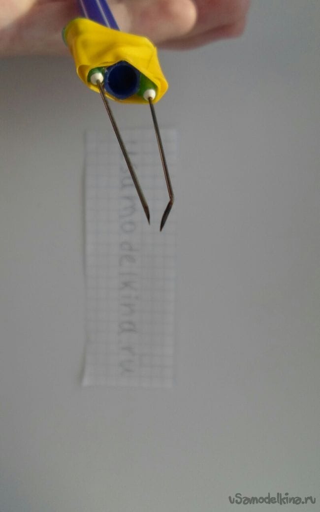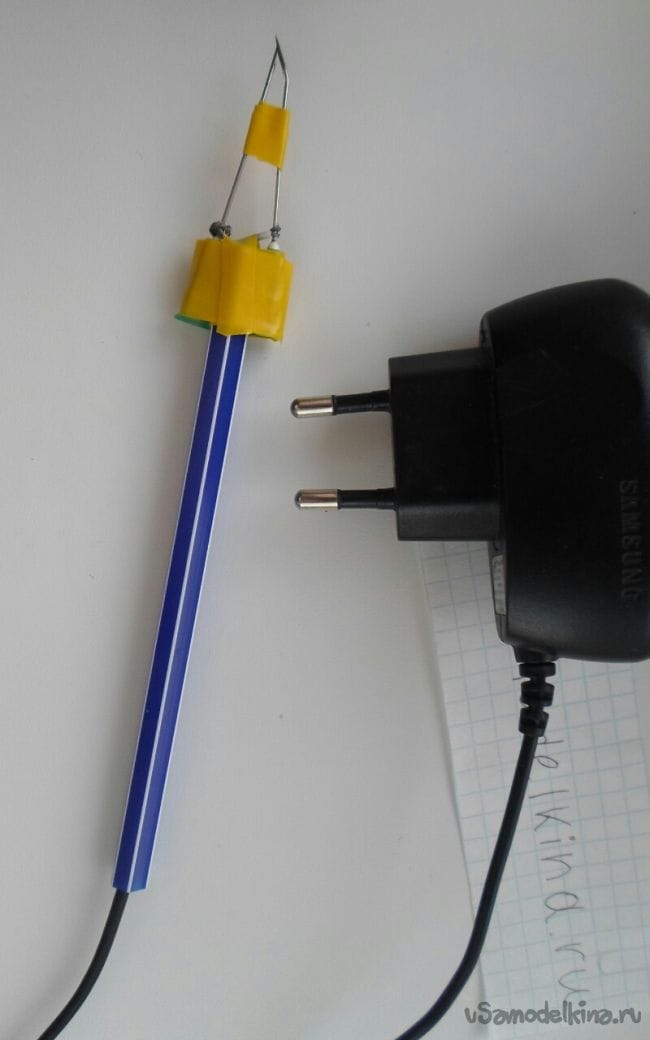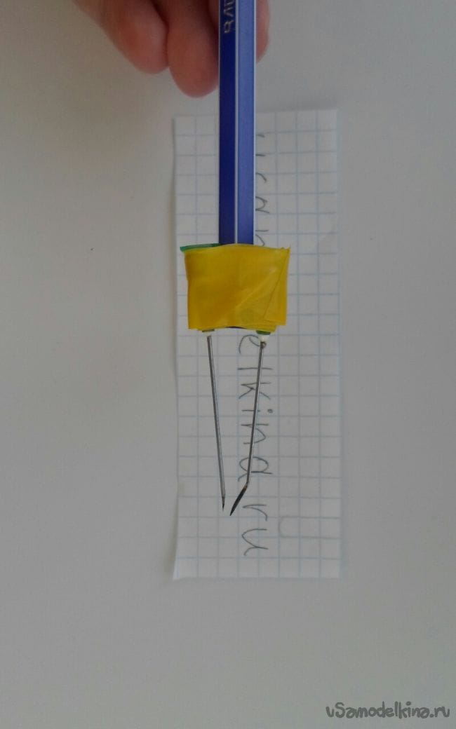 Две иголки необходимо примотать на ручку, хорошо закрепить их изолентой, в ручку просунуть провод и контактами примотать к иголкам, плюс к одной иголке, минус к другой. Иголки должны соприкасаться кончиками.