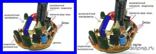 Для уменьшения габаритов балластных дросселей в них используют схемы высокочастотных преобразователей напряжения, которые в несколько раз уменьшают габариты дросселей.
