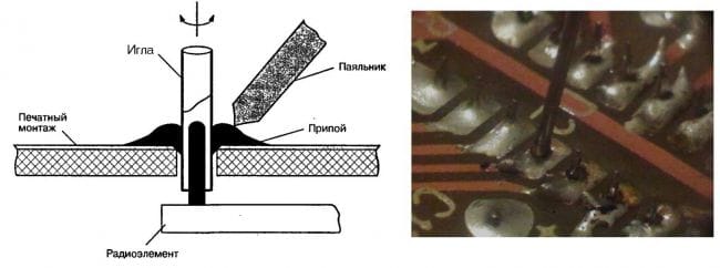 жалом паяльника плавиться припой, удерживающий ножку радиокомпонента и одновременно с этим в пустоту цилиндрической иглы впихивается вращением вывод с дальнейшим проталкиванием иглы сквозь отверстие платы. Так как обычно отверстие сверлиться немного больше, чем сам вывод электронного прибора, то игла легко проходит через него, такая фишка работает практически всегда.