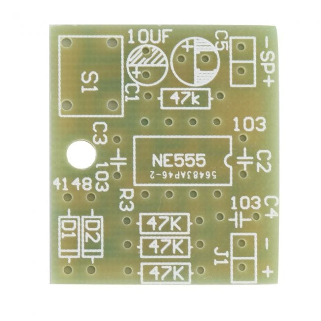 Для большего удобства маленькая тактовая кнопка заменяется большой, удобной для нажатия и выводиться в нужное место с помощью проводов. Схемы в комплекте нет, но это не проблема, так как все электронные элементы подписаны шелкографией прям на плате. Динамик весьма распространенный в китайских изделиях, он небольшой, хотя при этом достаточно громкий.