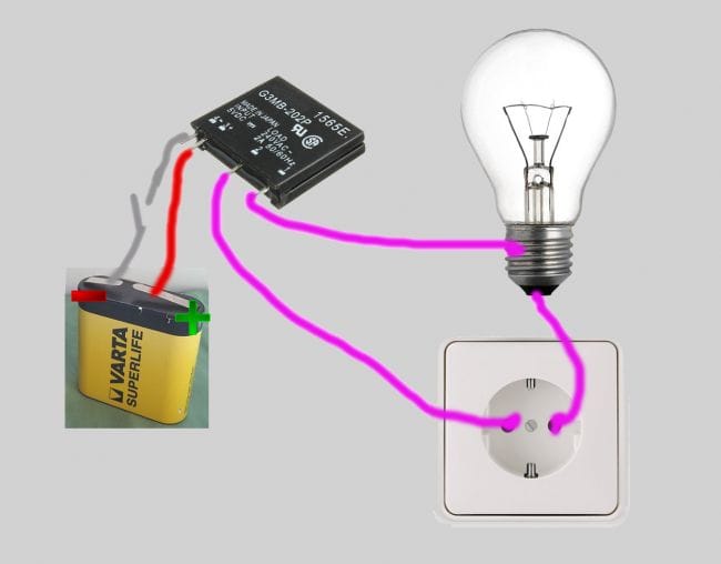 Принцип работы твердотельного оптического реле прост: при подаче тока на светодиод мы принуждаем его светиться, поток фотонов от него открывает специальный транзистор в середине прибора. Прямой ток светоизлучающего диода 5-20 mA, максимальный импульсный 50 mA. Габаритные размеры релюшки всего 20,5 на 24,5 на 5,5 мм. На рисунке ниже показана принципиальная схема подключения реле g3mb с управлением от батареек, где нагрузка - лампа накаливания.