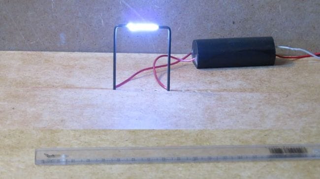 При 4,2 В и расстоянии между электродами 3 мм потребляемый ток составил 2,9 А, при этом выходная частота очень высокая. При расстоянии же 23 мм, что немного больше заявленной при U=4,5 В ток вышел 3 А. А вот 25 мм этот step-up преобразователь осилить не смог, только контакты искрили. Естественно прохождение тока сквозь воздух сопровождается громким треском (чем больше расстоянии, тем меньше частота), который мягко говоря взбудораживает.