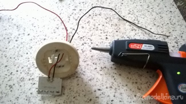 Просунул провода через крышку и зафиксировал блок горячим клеем.