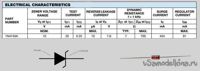 Сначала последовательно включены резистор стабилитрон и еще один резистор. На стабилитроне падает то напряжение, на которое он рассчитан, в нашем случае 10 В, в его технической документации (1N4740A) указана максимальная мощность 1 Ватт, напряжение стабилизации 10 В (ZENER VOLTAGE RANGE), значит максимальный допустимый ток 1W/10V=0.1A, но на самом деле 91 mA (REGULATOR CURRENT), номинальный же ток стабилизации равен 25mA (TEST CURRENT).