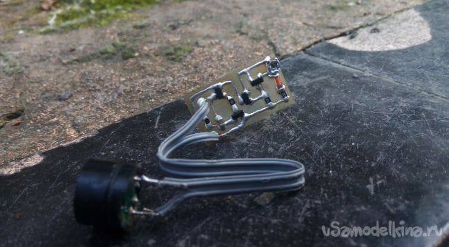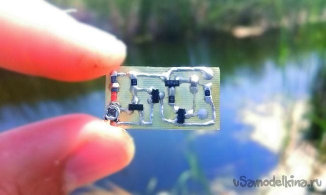 Схемка очень простая и собрал я её используя компоненты для поверхностного монтажа, что поспособствовало максимальной миниатюризации платки, размеры 24 на 13 мм. Потребление в автономном режиме вышло в ~2 mA, а при сигнале достигает 15-20 mA.