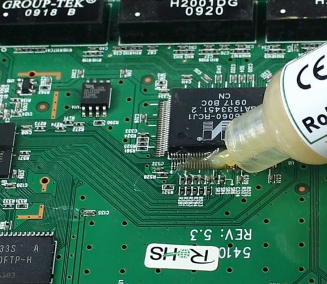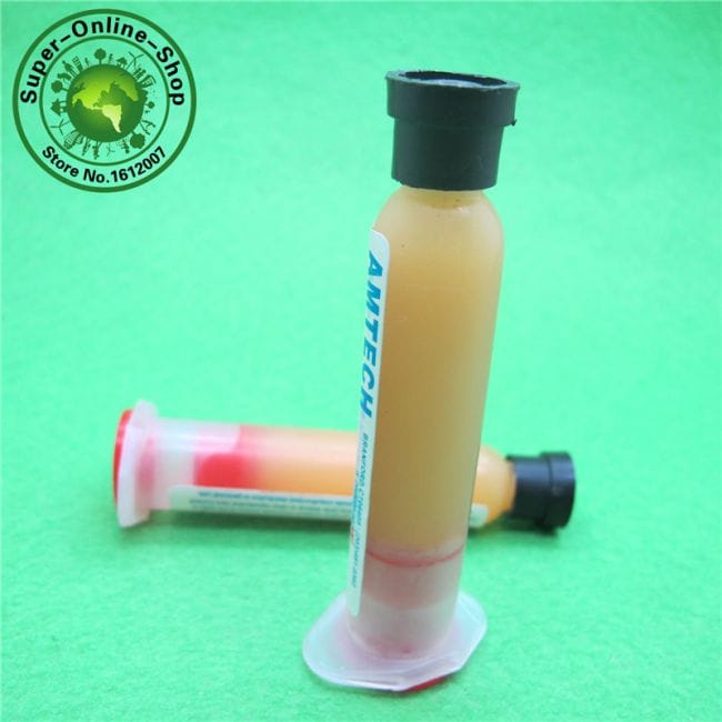 При качественной пайки обязательным условием является использование флюса, который эффективно удаляет окислы с поверхности дорожек и выводов компонентов, уменьшает силу поверхностного натяжения, а также в целом улучшает текучесть припоя. Для некоторых работ лучше всего подходит густая паяльная паста, как например RMA-223, а в нашем случае копия широко известного американского флюса от компании amtech. Он отлично подойдет для реболлинга больших микросхем, их демонтаж и монтаж с использованием паяльного фена.