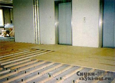 Другой способ выравнивания основы – устройство фальшполов – регулируемых полов на лагах. В данном случае на жестком основании крепятся стойки с болтами, на которых закрепляются деревянные лаги. Выравнивание уровня основы достигается при помощи вращения лагов.