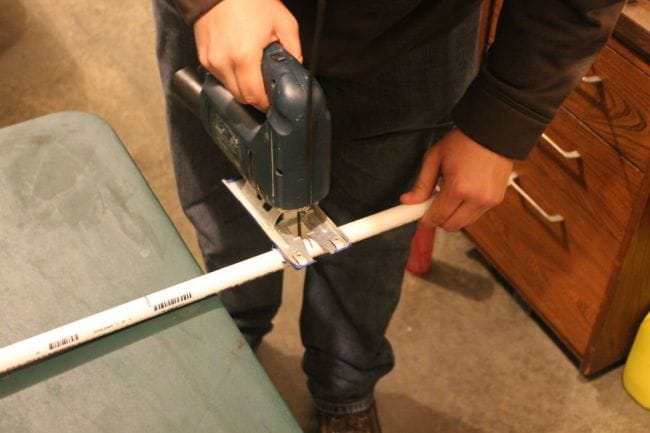 Следуя отмеренным точкам, ПВХ труба была распилена на необходимые составляющие части для сбора подставки.