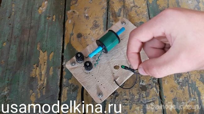 Многие согласятся, что использование пушки в таком виде крайне неудобно и неэстетично, а порой даже очень опасно. Поэтому я смонтировал устройство на небольшом кусочке фанеры. Для катушки установил отдельные клеммы. Это дает возможность быстро менять соленоид и экспериментировать с разными вариантами. Для лампочки я установил два тонких обрезанных гвоздя. Концы проводов лампочки просто обкручиваются вокруг них, поэтому лампочка меняется очень быстро. Обратите внимание, что сама колба находится в специально проделанном отверстии.