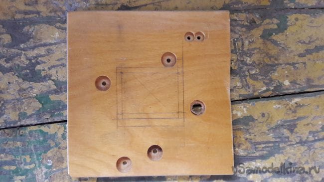 Пора заняться разметкой отверстий. По очереди проведем две линии из двух противоположных углов. Затем найдем центр деревянного квадрата. Замерим размеры пластикового держателя пружины Делим эти размеры на два, отнимаем 0.5 и откладываем их с каждой стороны от центральной точки.
