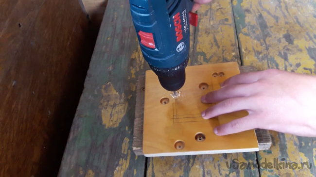А сейчас займемся подготовкой катушки. С каждой стороны отмеряем по половине сантиметра, проводим линии, а на их пересечении в углах сверлим небольшие отверстия.