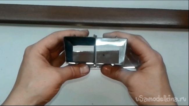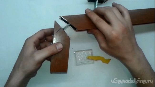 Теперь нужно нарезать зеркала. Высоту зеркала составит длинна отрезанного угла, а ширина будет такая же, как и внутренняя ширина профиля. Складываем части перископа и чертим ориентировочную линию для установки зеркал под углом 45 градусов. Далее, клеевым пистолетом клеим зеркала к коротким частям перископа.