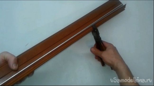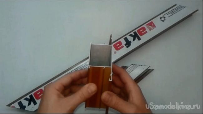 Куски профиля алюминиевых рам обрезаем под углом 45 градусов, а затем удаляем лишние части профиля. Проводя раз за разом ножом вдоль профиля, можно сделать достаточный надрез чтобы ненужные куски с легкостью отломались. Так как алюминий достаточно мягкий металл, делать надрезы не составляет особого труда.