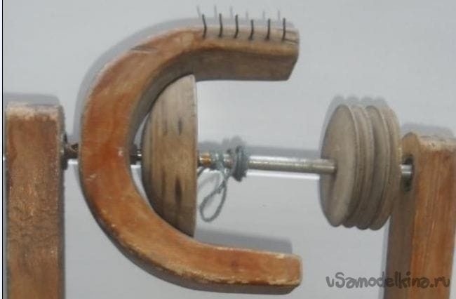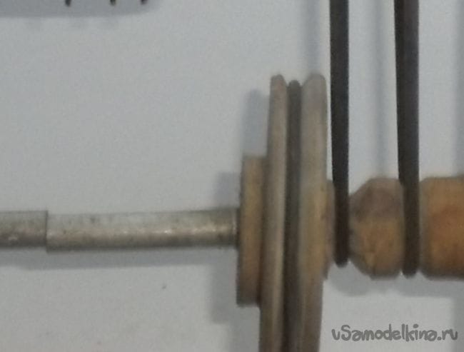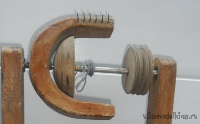 Запускать прялку на малых оборотах было проблематично и изготовил промежуточный вал с тремя шкивками, которые выточил из дерева. Снизил обороты на прялку. Шкив на катушку с меньшим диаметром, чем на рогульку.