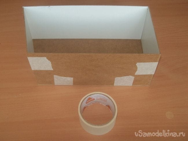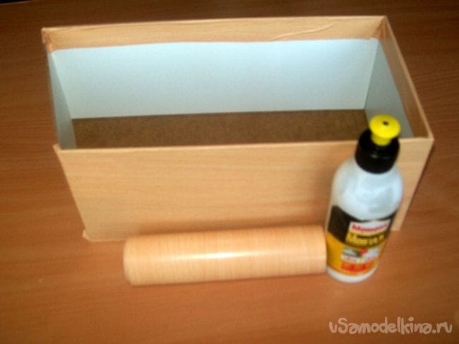 Обклеиваем с внешней стороны самоклеющейся плёнкой, а кисточкой изнутри, промазываем все швы клеем «Момент».