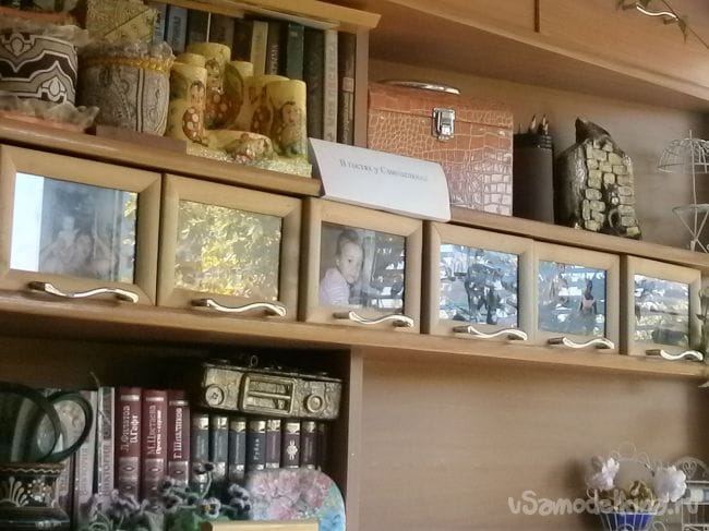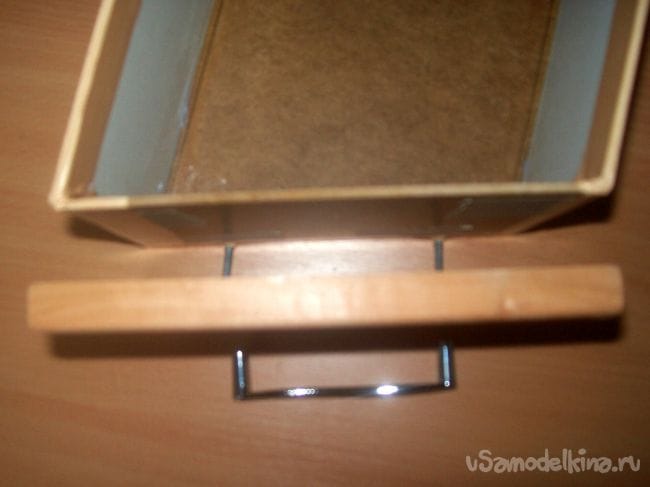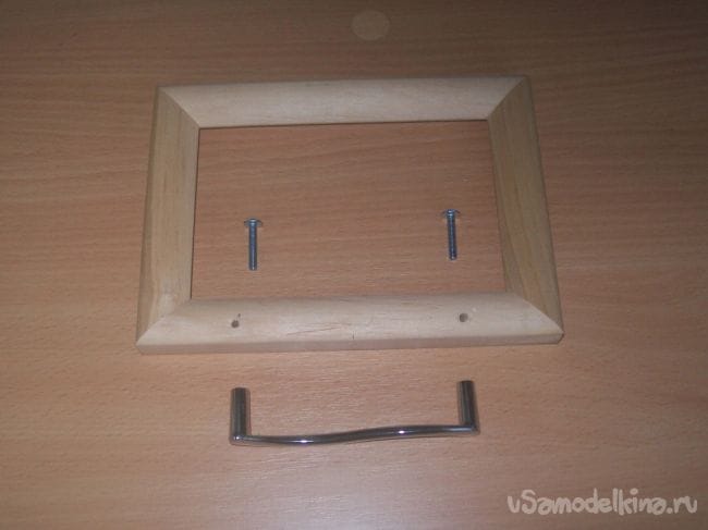 Фасад коробочки оформляем рамочкой для фото. А для удобства доставания, под небольшую ручку (я покупала в ближайшем мебельном магазине), сверлим (или прокалываем мощным шилом) два отверстия.