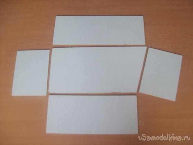 Как творческий человек, покупать готовые я не хотела, да и «совсем в размер» не попадались, а свободное пространство терять не хотелось. Делать их из ДСП – тоже не то: они бы оказались тяжеловесными, да и толщина самой плиты «съедала» бы их объём. Поэтому взялась делать их из оргалита: тонкий, прочный и достаточно лёгкий материал. А так как полочка, на которую и предполагалось ставить эти коробочки, не совсем обычной формы (с одной стороны она глубиной 40 см, а с другой – всего 10), то и раскрой их вот такой: