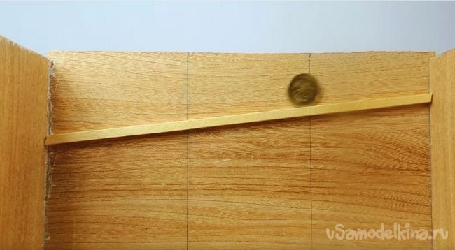Для данного механизма нам нужно взять шпажки для шашлыка или маленькие деревянные брусочки и клей, ставим наш каркас копилки на стол и приклеиваем наш брусочек строго под углом 20-30 градусов, и проверяем как катится наша монетка! Замечательно она катится, теперь нам нужно сделать распределитель для наших монет, все мы знаем каждая монета имеет свою высоту. Для этого мы поставим ограничители по высоте!
