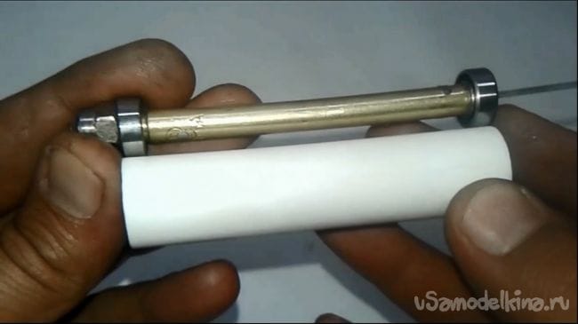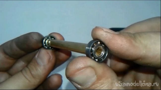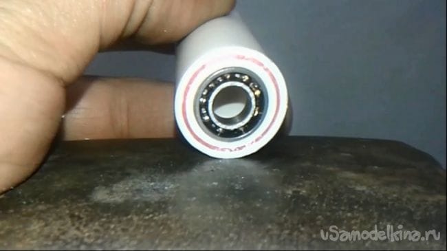 Немного сняв фаску с пластиковой трубки запрессовываем задний подшипник. А затем пропустив через него трос и установив в него вал запрессовываем и передний до тех пор, пока не исчезнет люфт между валом, и подшипниками.