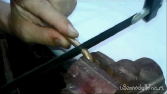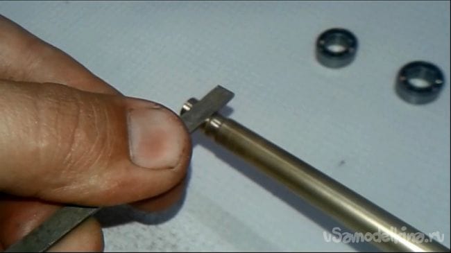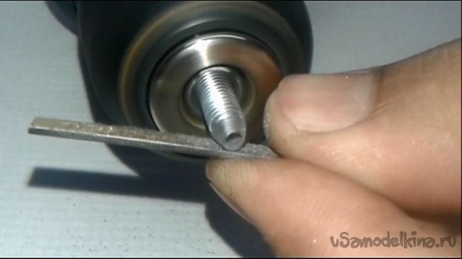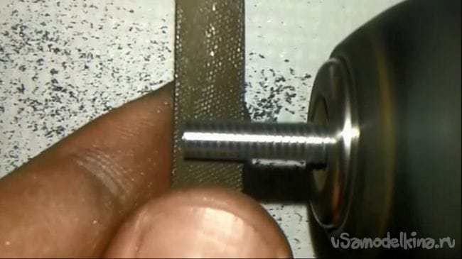 зажимаем будущий вал в патроне шуруповерта и вращая его, надфилем растачиваем шейки для подшипников.