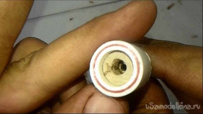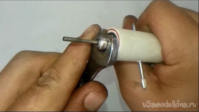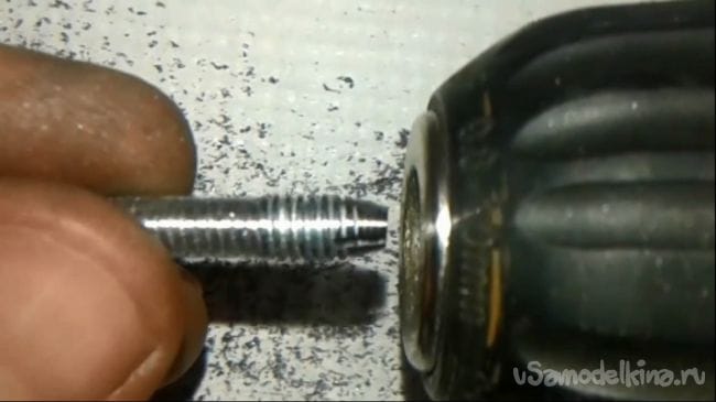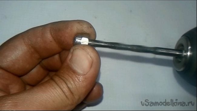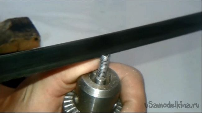 Затем разворачиваем заготовку, зафиксировав 12 мм стержня конической частью в патроне шуруповерта, стачиваем резьбу хвостовика, тем самым уменьшаем диаметр детали до 5 мм. А на самом вале увеличиваем внутренний диаметр сверлом 5 мм, углубив его примерно на 2 сантиметра.