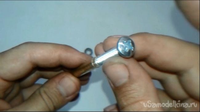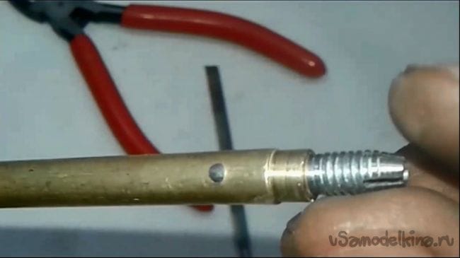 Замерив толщину троса, сверлом 1,5 мм просверливаем винт и отрезав шляпку уменьшаем диаметр стержня все тем же способом.