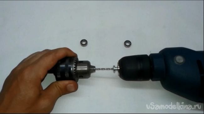Сверлом 2,5 сверлим корпус, а затем и вал. После этого мне пришлось выбить подшипники, очистить их от стружки и повторить операцию по сборке. К счастью это не заняло более пяти минут.