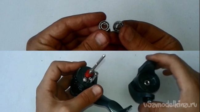 Для него нам понадобятся два подшипника от безынерционных катушек. Подобные подшипники я видел в продаже подшипники в магазине радио деталей. Покупать я их не стал, так как у меня имелись в наличии сломанные катушки.