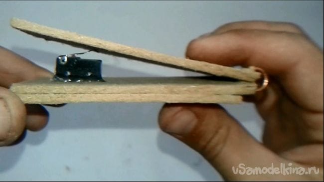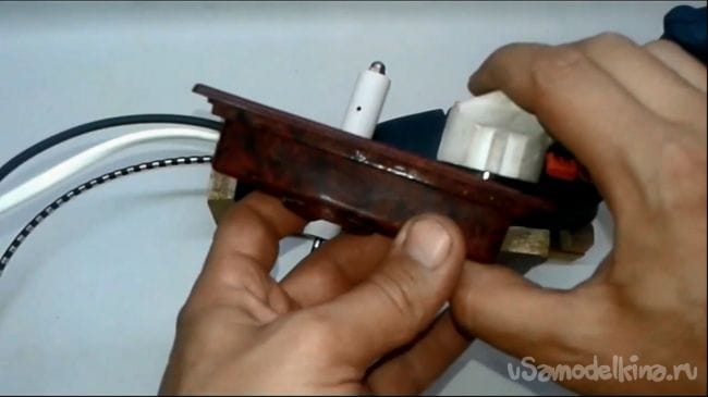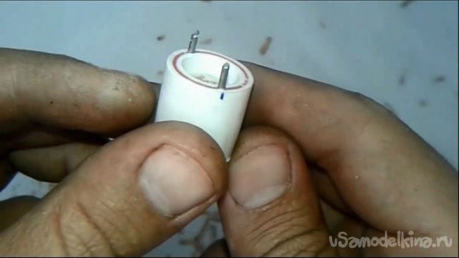 Сложив обе части корпуса, отмечаем места под их крепления между собой. По отметкам сверлом на 1,5 сверлим отверстия, глубиной примерно 5мм и из подходящего по диаметру гвоздя, делаем штырь крепления длинной около 1 см.