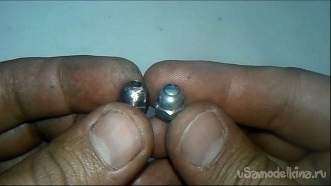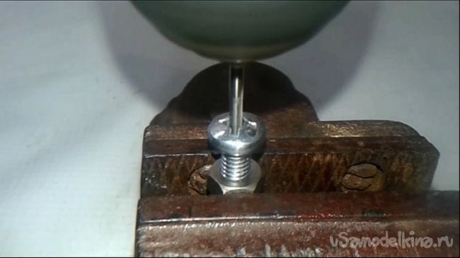 Что бы в гайке точно по центру сделать отверстие, я просверлил еще один винт и плотно завернув винт в гайке, тем же сверлом просверлил в ней отверстие.