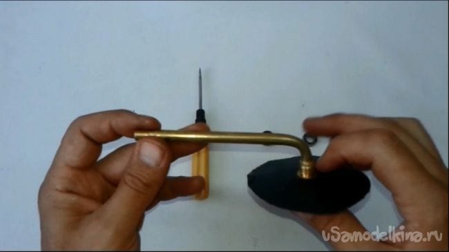 Отмечаем точку сверления и делаем отверстия на валу, а затем и в стержне установив его в вал. После, штифтуем, скрепляя детали между собой.