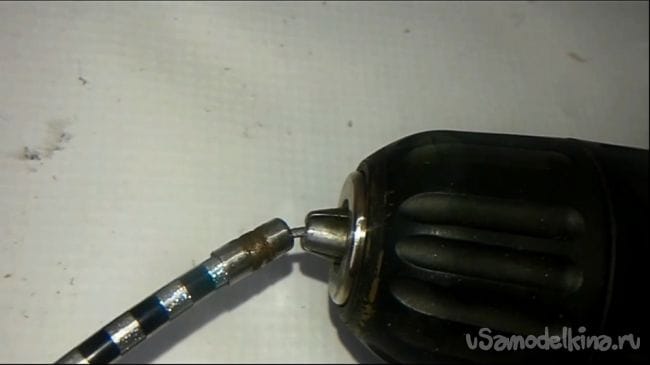 В качестве гибкого рукава бор машины, я использовал тормозной трос велосипеда. Вращаясь в рубашке, трос будет передавать кинетическую энергию шуруповерта на наконечник.