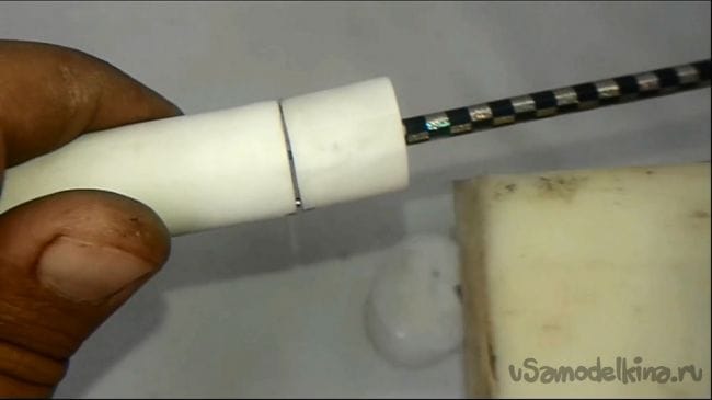 Теперь нужно закрепить рубашку троса к корпусу наконечника. Для этого отрезаем пластиковую трубку длиной 2 сантиметра и делаем для нее сердцевину из деревянного бруска. Сделав деревянную болванку диаметром чуть большим чем внутренний диаметр трубки и длиной примерно 1,5 сантиметра, запрессовываем ее в трубку.
