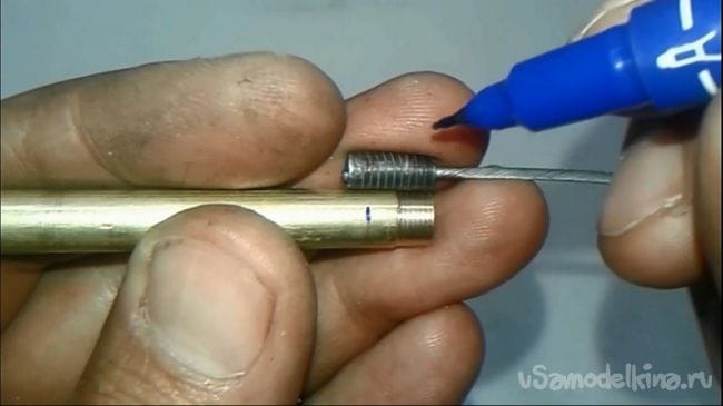 В центре сердечника сверлим отверстие чуть меньшим диаметром муфты рубашки троса и фиксируем ее в нем.
