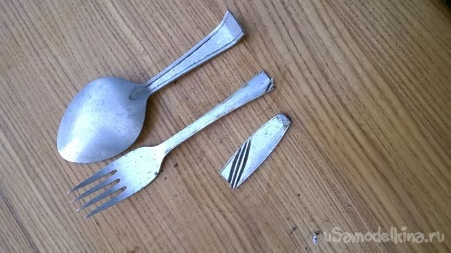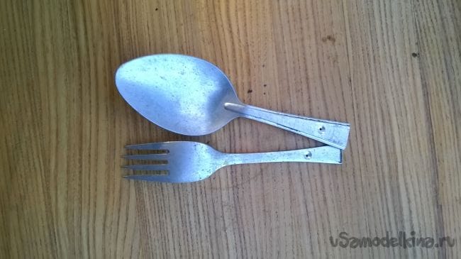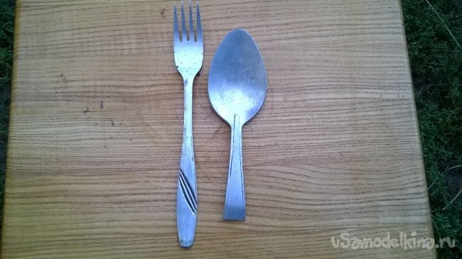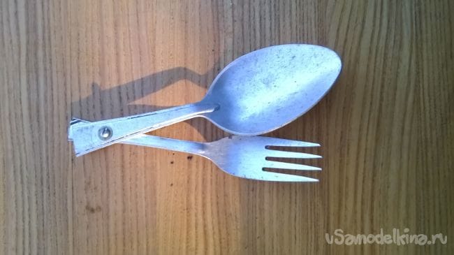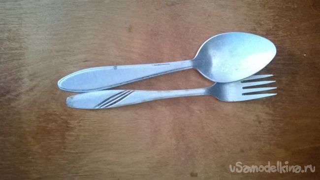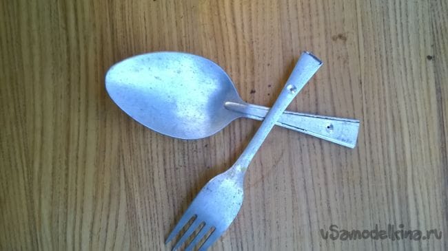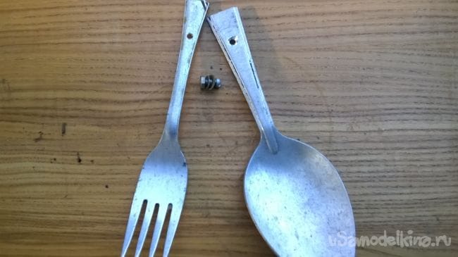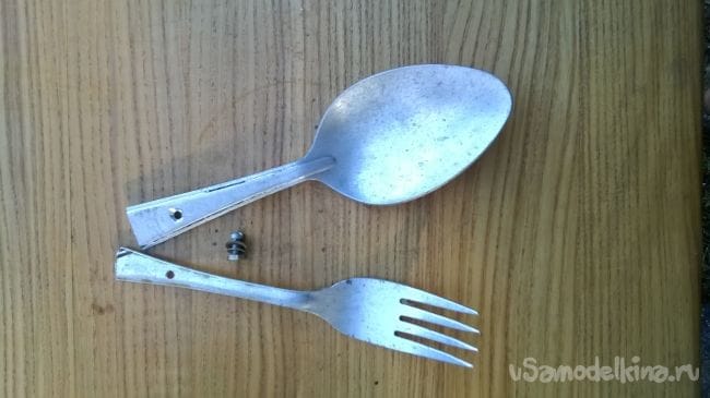 Нам понадобится алюминиевые ложка и вилка, которые мы соединим вместе и чтоб они были складными.