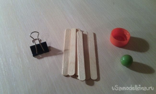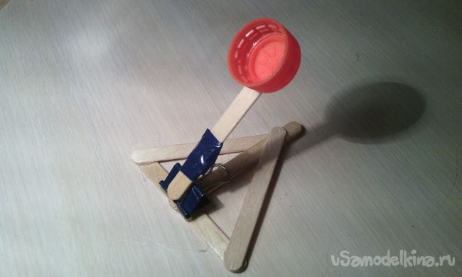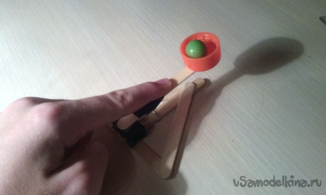 Ну вот и всё наша мини катапульта готова, для того чтобы из неё стрелять нужно в крышку от бутыли положить какой-нибудь небольшой предмет (бусинку или просто скомканный кусок бумаги, я использовал небольшой шарик) нажать на верхнюю палочку от мороженного и резко отпустить и катапульта выстрелит шариком.