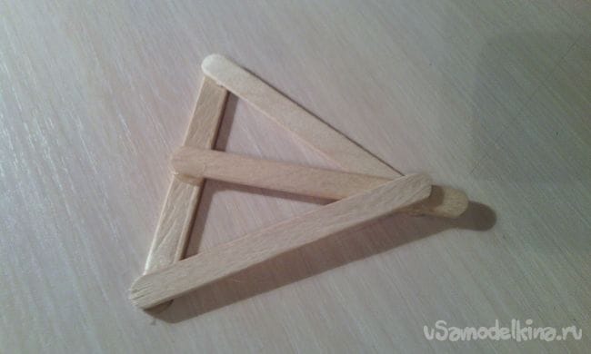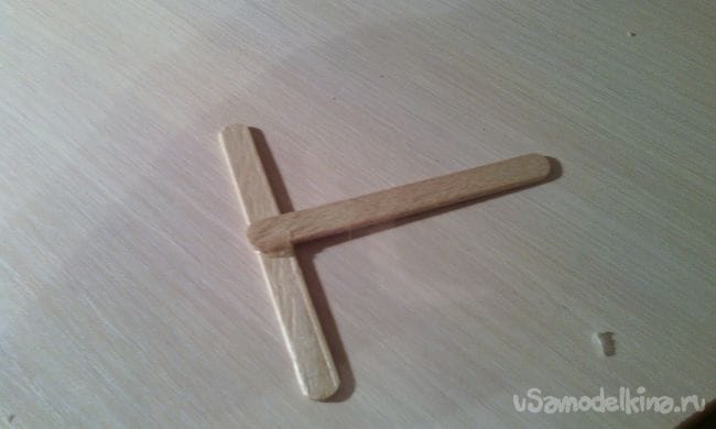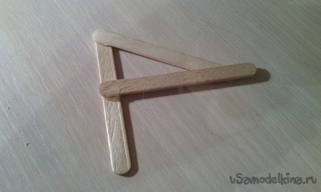 Для начала нужно приклеить палочки от мороженного к друг другу так как показано на фото: