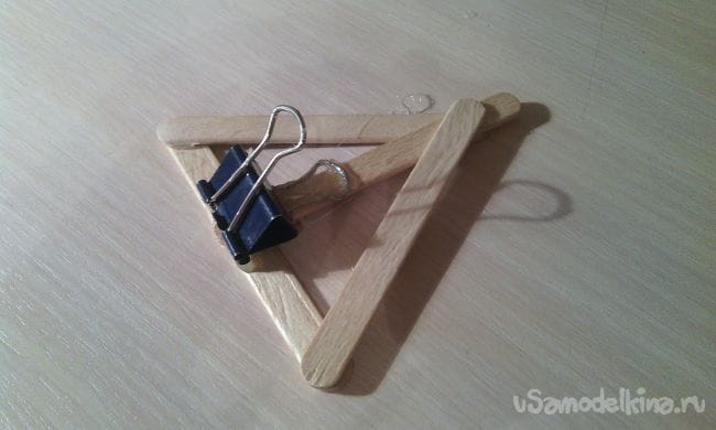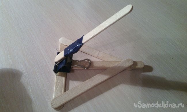 Теперь нужно приклеить ещё одну палочку для мороженного к зажиму для бумаги так как показано на фото (при желании можно всё крепко замотать изолентой)