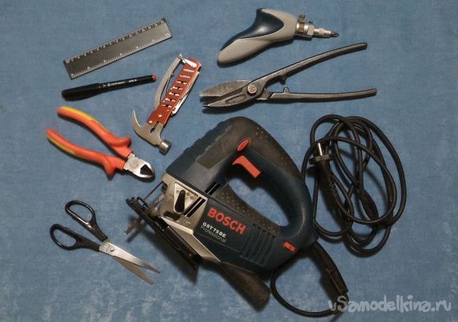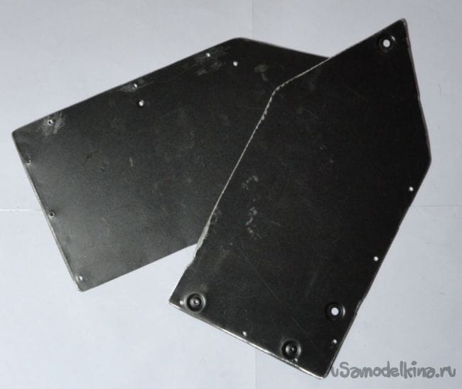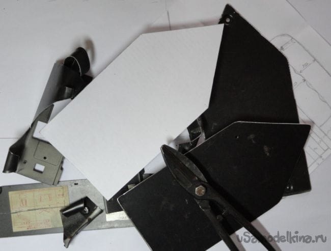 Ножницами по металлу вырезаем детали для боковых стенок комбайна.