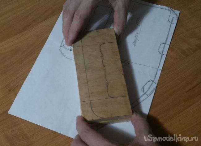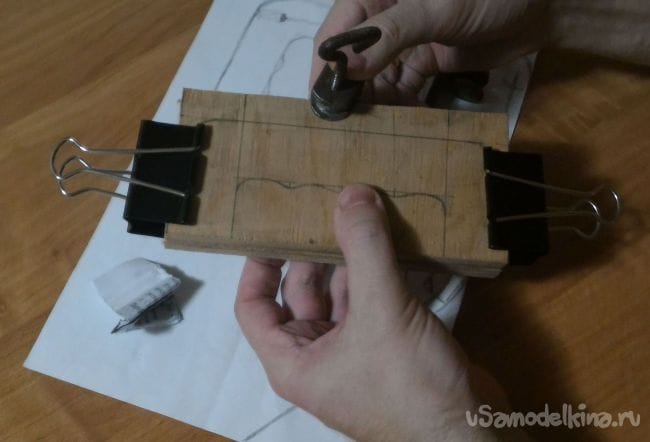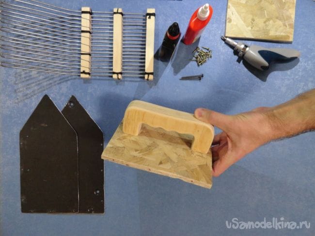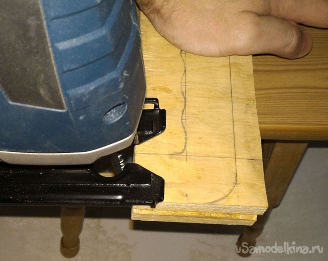 После высыхания клея, электро-лобзиком выпиливаем ручку. Ручку зачищаем наждачной бумагой, для закругления острых граней.