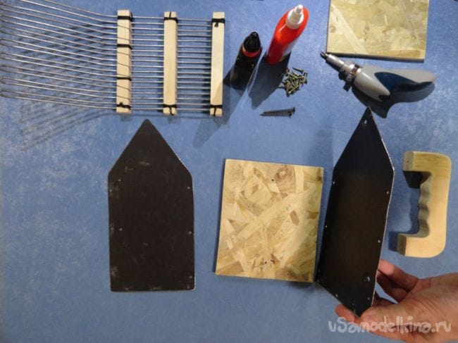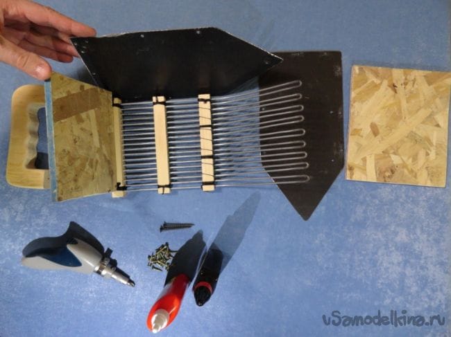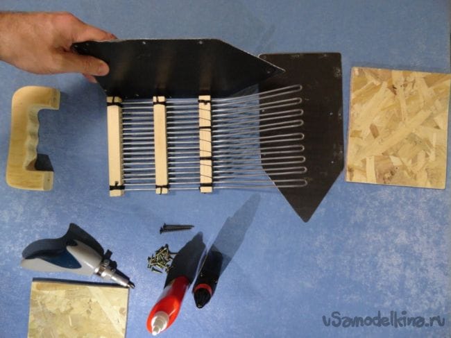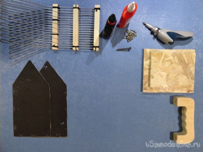 Как обычно, сборка устройства будет производиться из подручного материала: небольшие куски фанеры, корпус от CD чейнджера (разборка на указанном выше канале), проволока, шурупы, капроновая нить, клей.