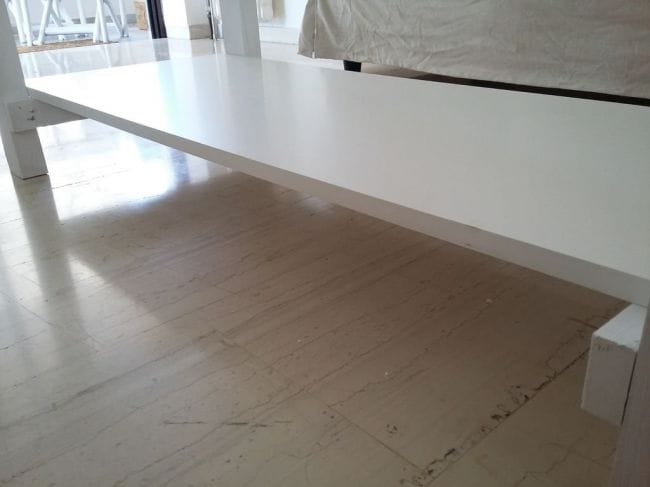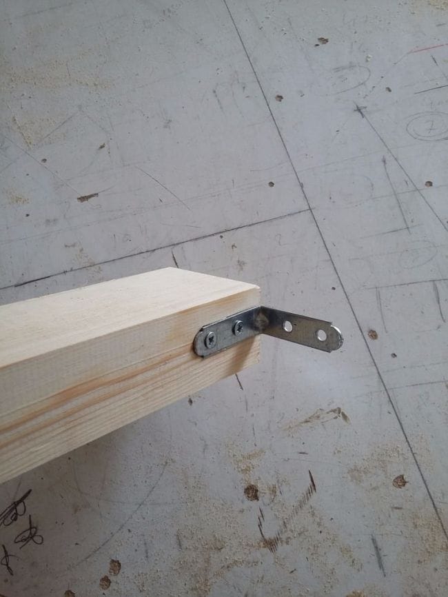 Четвертый шаг. Приготовленные ножки и балки поменьше необходимо зашлифовать обычной наждачной бумагой или же шлифовальной машинкой, а затем покрасить белой краской, в данной самоделке покраска имеют немаловажную роль, поэтому если у вас имеется краскопульт, то лучше воспользуйтесь именно им, а не кисточкой. После высыхания краски переходим к крепежам. Вооружившись шуруповертом и шурупами, к верхней части ножек прикручиваем металлические уголки под 90 градусов и не забывайте, что все отверстия под шурупы должны быть заняты после закрепления, не жалейте материалов для самого себя же, так как стол может получится неустойчивым.