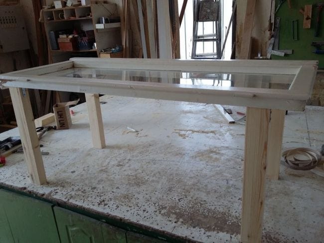 Аналогичным способом закручиваем сами ножки к нашей импровизированной столешнице из окна, далее упрочняем конструкцию с помощью нижних балок, прикрученных на расстоянии около 20 см от пола, а затем устанавливаем нижнюю поверхность стола, которая будет служить нам в качестве полки, материал для нее подойдет любой, будь то фанера или дсп.