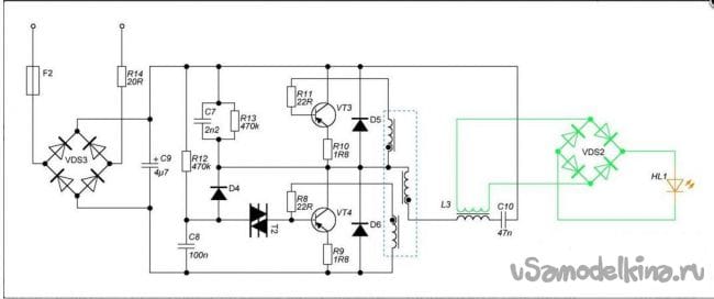 Схема переделанной электронной платы преобразователя. В результате из дросселя получаем трансформатор с подключенным выпрямителем. Зеленым цветом показаны добавленные компоненты.
