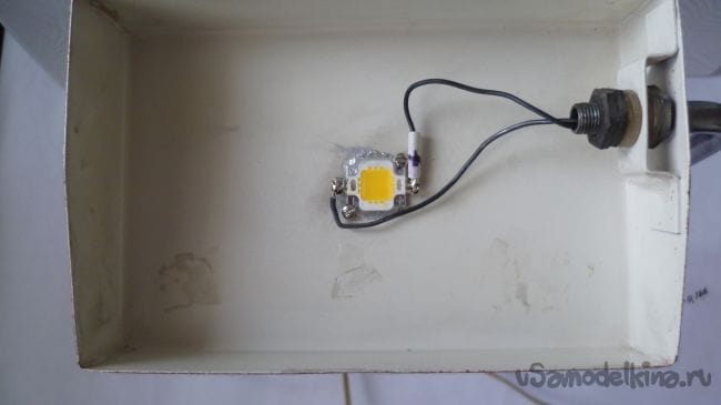 Патрон для лампы на 220 вольт убираем. Светодиод мощностью 10Вт установил на термопасту на металлический абажур старой настольной лампы. Абажур настольной лампы служит теплоотводом для светодиода.