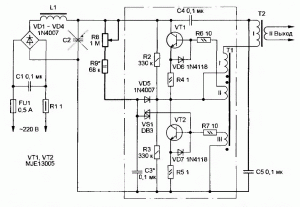 Также возможно запитать светодиоды меньшей мощности, подобрав требуемое напряжение количеством витков на дросселе.
