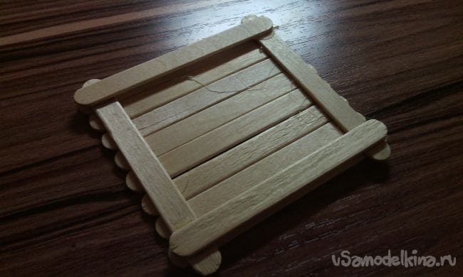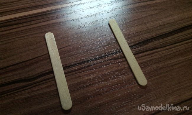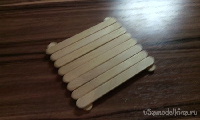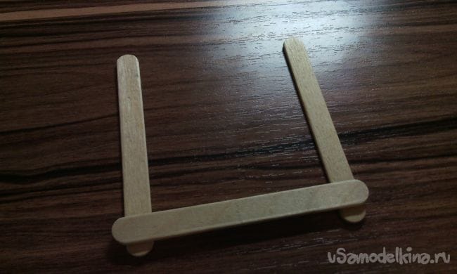 Переворачиваем нашу конструкцию и приклеиваем ещё две палочки, которые будут служить нам в роли ножек: