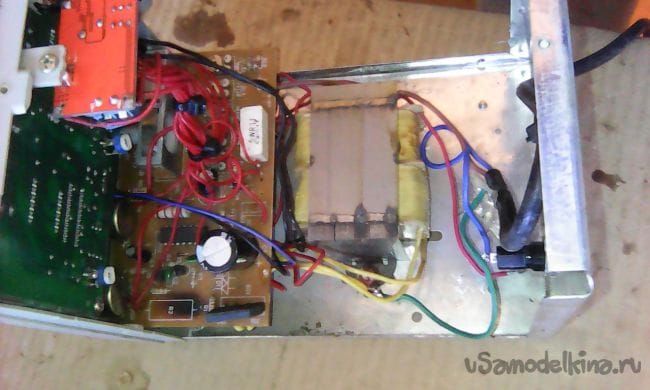 Установлен мощный диод параллельно клеммам выхода напряжения в обратной полярности, для зашиты блока питания в случаи подключения аккумулятора в обратной полярности.